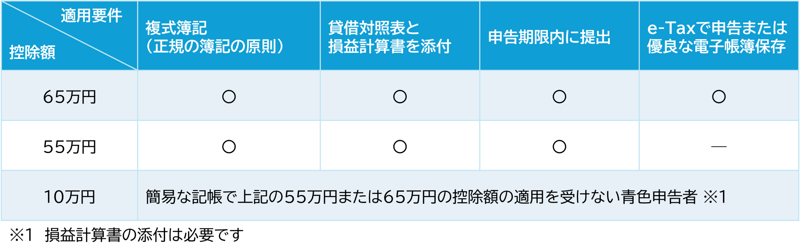 正規の簿記の原則(一般的には「複式簿記」をいいます)により記帳し、その帳簿にもとづいて、貸借対照表、損益計算書等(青色申告決算書)を作成し、これらを確定申告書に添付して、申告期限内に提出した場合に控除することができます。